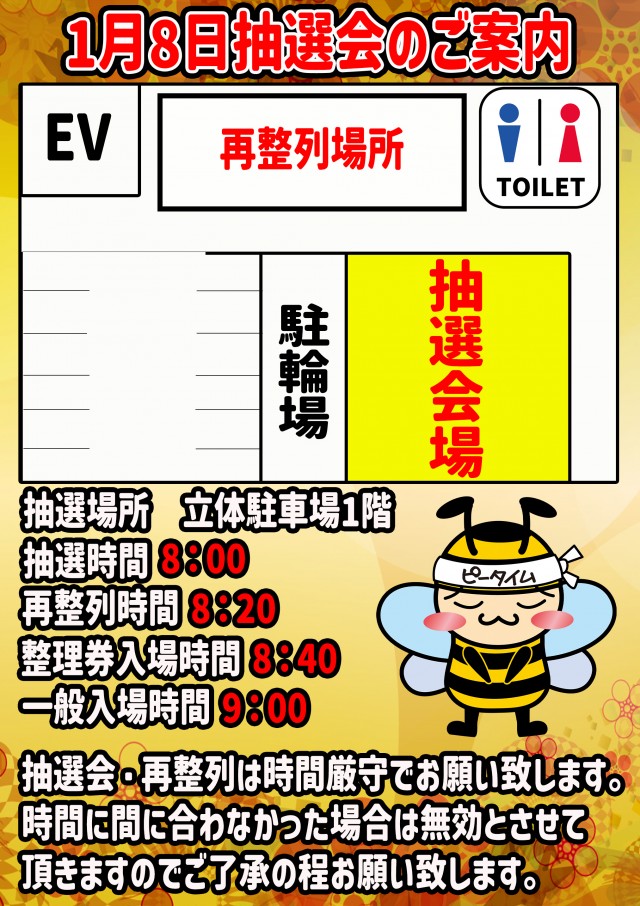 毎朝9時オープン 【抽選】8:45より入場整理券の抽選 【その他】整理券の抽選が終わり次第・入場整列、9:00入場 ※整理券入場整列の際、確認の取れない整理券番号は9:00に入場出来ない場合が御座います。 |
