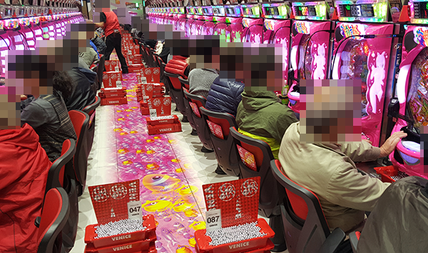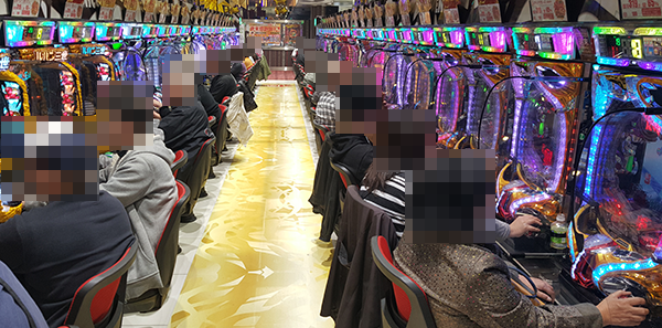 14時を過ぎた頃の4円パチンコでは、海物語シリーズが盛況。