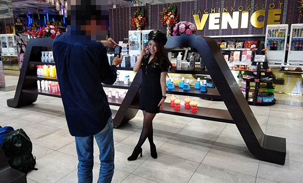ミニスカポリス風コスチュームで参上! お客様と一緒に開店を待ちま~す♪