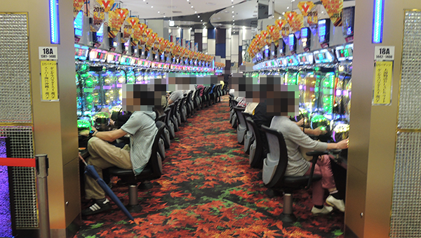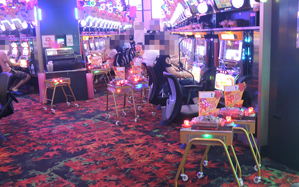 夕方頃の4円パチンコでは、「CR牙狼 魔戒ノ花」と海物語シリーズが盛況。機種の性能を最大限まで引き出しているような姿が多く、各シマには華やかな光景が広がっていた。
