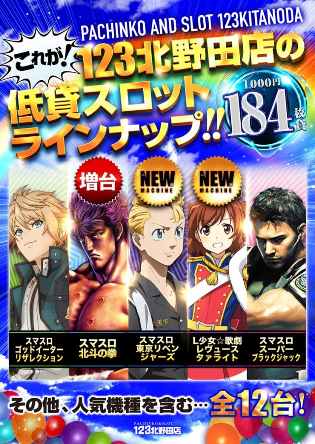 最新台から人気台まで色々選んで楽しめる明日、21日の水曜日は南海北野田駅降りてスグの123北野田店で存分ッに‼ -