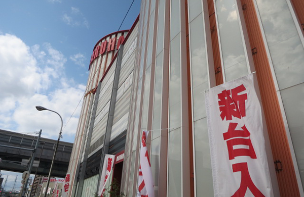 1000台を超える総設置台数や広い駐車場がある大型店。前日におこなった取材時には、ホールの規模とおなじくらいに大きな活気を感じられた。