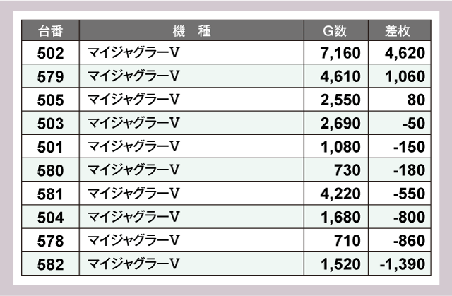 まずパチスロコーナーをチェックすると、『マイジャグラーⅤ』で4,000枚オーバーの優秀台を確認することができた。