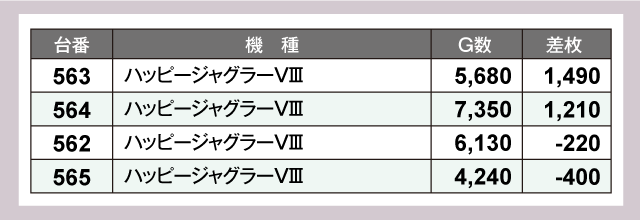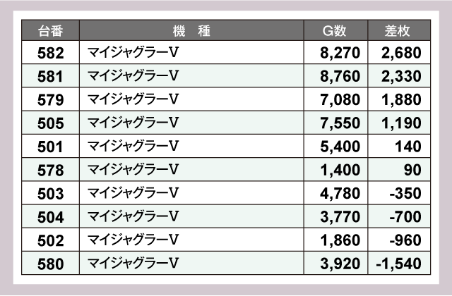 まずはパチスロコーナーをチェックしてみると『マイジャグラーⅤ』が特に活況で全10台中6台がプラス差枚、そのうちの2台は+2,000枚超を記録している。