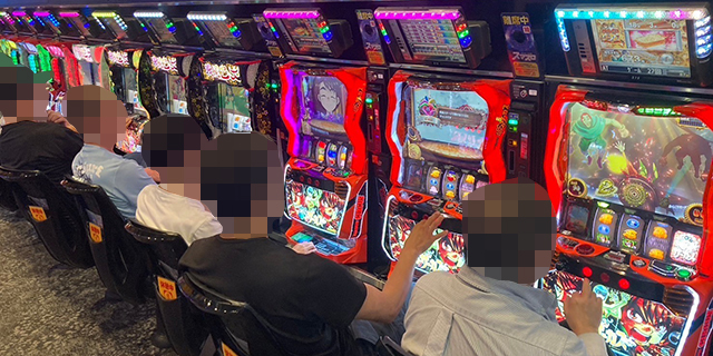 この日はパチスロコーナーが主役。どのシマも楽しそうな表情で遊技するプレイヤーであふれていて、各人が一心不乱に打ちこんでいた。