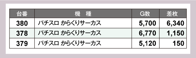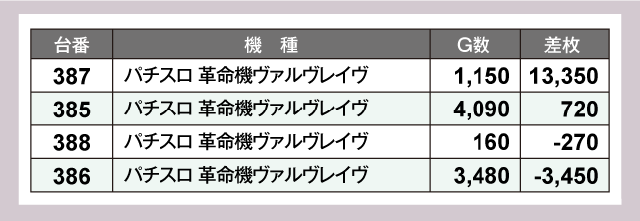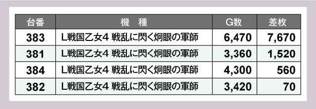 圧倒的だったのは『パチスロ 革命機ヴァルヴレイヴ』の387番台。なんと+13,350枚という衝撃の差枚を叩きだした。次いで『L戦国乙女4 戦乱に閃く炯眼の軍師』383番台が+7,670枚、『パチスロ からくりサーカス』380番台が+6,340枚と、それぞれが大満足の結果を残している。