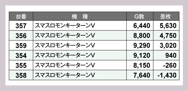 とくに注目したいのは『スマスロモンキーターンV』。いずれの台も高稼働で、6台中4台がプラス差枚かつ、+5,000枚・+4,000枚オーバーが飛びだす優秀な成績をおさめていた。同店の設置機種のなかでも、メインとしての実力をプレイヤーたちに示している。