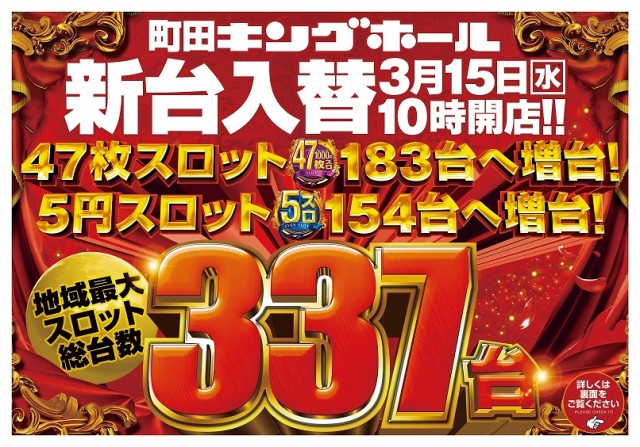 町田キング新台入替!47枚スロ5スロ増台!地域最大保有数!