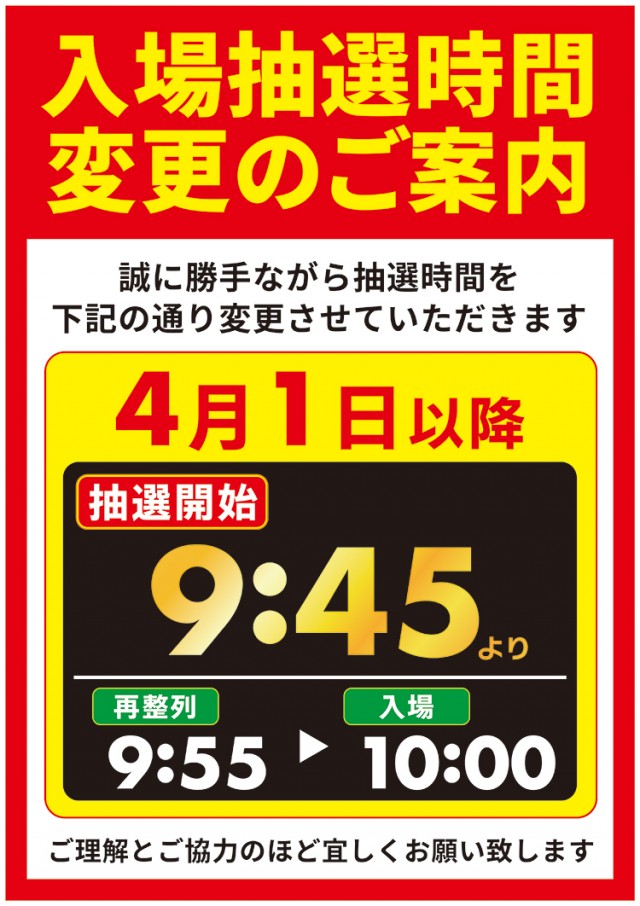 入場抽選:9:45開始、抽選場所:スロット側入口付近 |