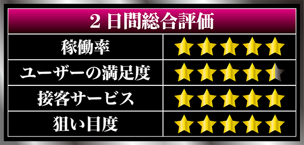 また、1円パチンコの稼働率も高く、海物語シリーズや「CRヱヴァンゲリヲン~いま、目覚めの時~」、「CRフィーバータイガーマスク3-ONLY ONE-」といったさまざまな機種が楽しまれていた。