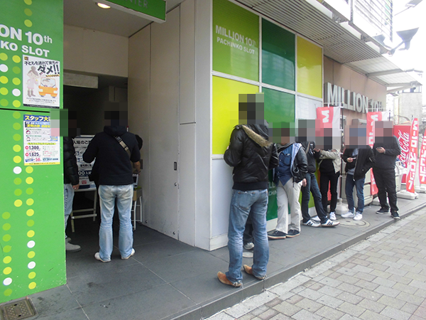 開店前の入場抽選には多くのプレイヤーが参加。なかには、プレイヤー同士で機種に関しての話を楽しそうにしているといったシーンもみられ、にぎやかなムードが感じられた。