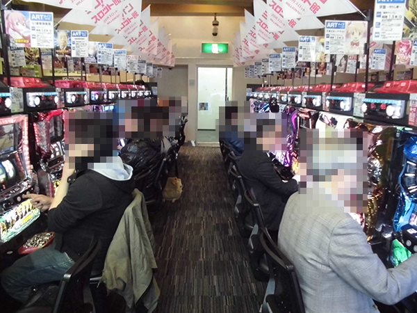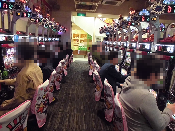 開店して間もない頃の20円パチスロでは、新台の「押忍!番長3」がすぐさま満席。台の様子をみにくるプレイヤーも多く、注目度の高さがうかがえた。