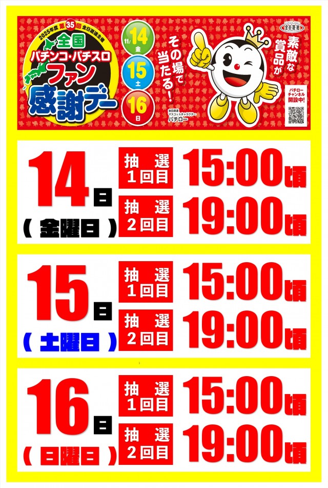 明日より3日間全国パチンコ・パチスロファン感謝デー開催☆予定
