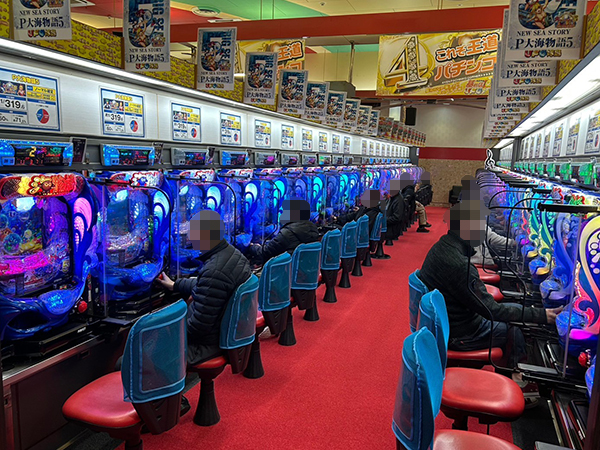 13時半ごろの4円パチンコの様子を見ると「P大海物語5」といった海物語シリーズが大盛り上がり。機種性能を存分に発揮するプレイヤーを目の当たりにしている。