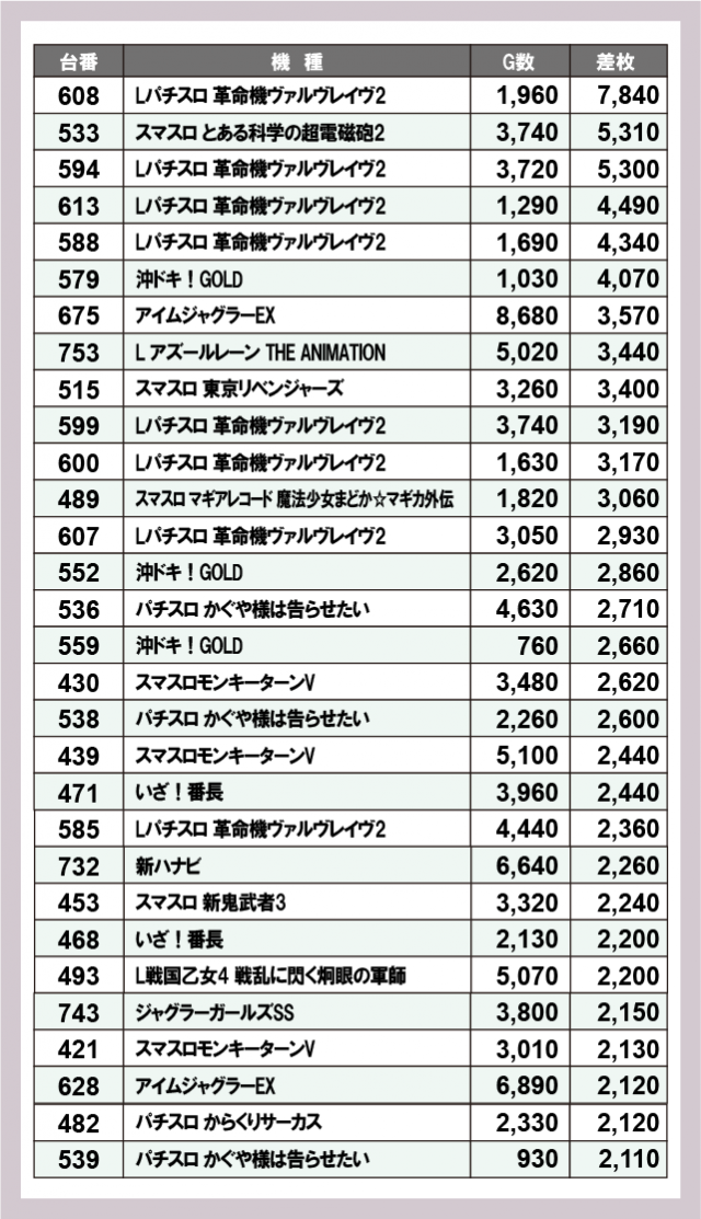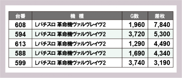 今回のランキングでは『Lパチスロ 革命機ヴァルヴレイヴ2』が圧倒的な存在感を放ち、複数台が上位に名を連ねる結果となった。また『沖ドキ!GOLD』『新ハナビ』、さらに『ジャグラー』シリーズといったメダル機も軒並みランクインしており、幅広いジャンルでチャンスが広がっていたことがうかがえる。