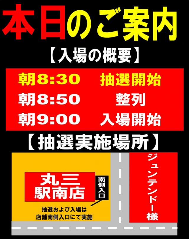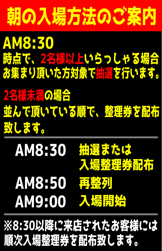 「2名以上の並びで8:30~入場順番抽選実施」 |