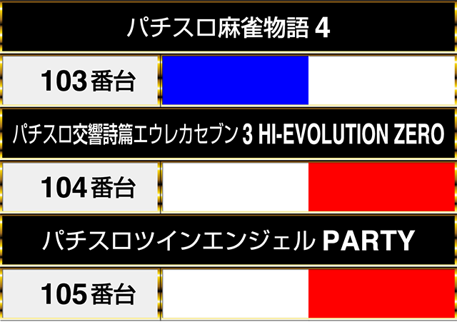 『パチスロ交響詩篇エウレカセブン3 HI-EVOLUTION ZERO』の104番台と105番台の『パチスロツインエンジェルPARTY』が並んでプラスpt!!