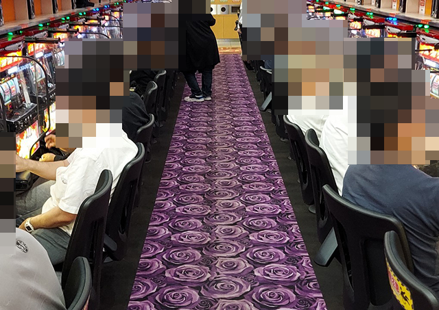 夕方頃にパチスロコーナーをみてみると、ジャグラーシリーズに多くのプレイヤーが集まっていた。