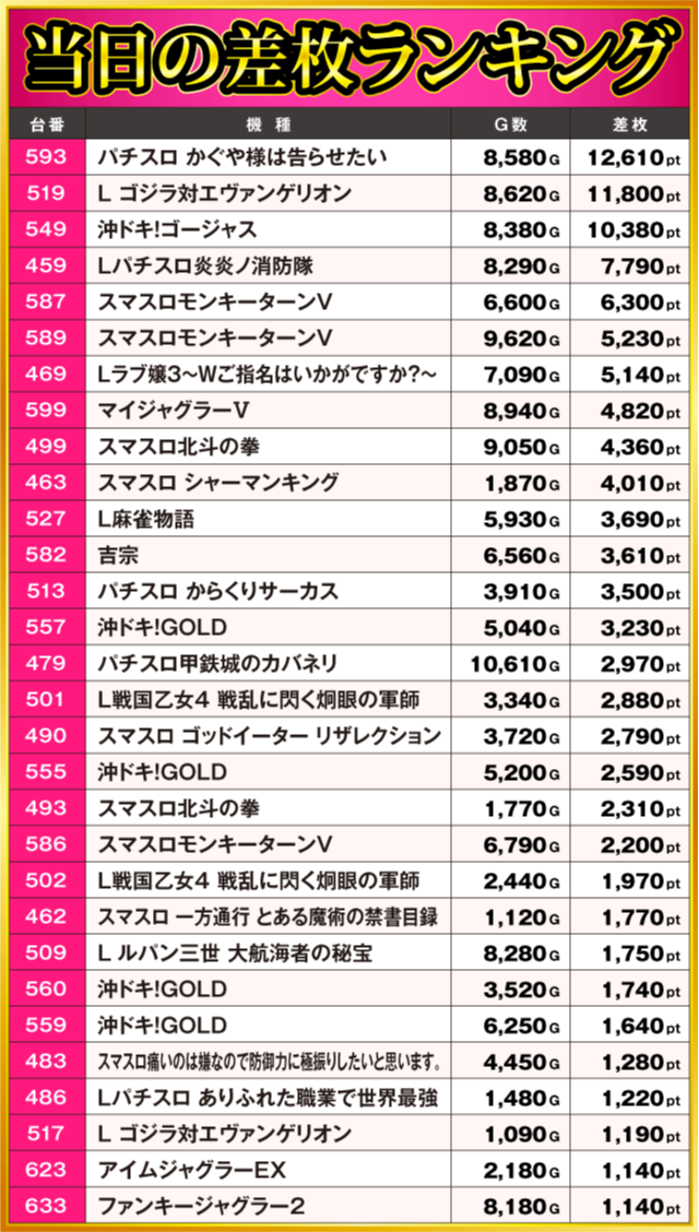 早速、店内状況を見てみると、この日は台番号の末尾が9の台で好調台を多数確認。『L ゴジラ対エヴァンゲリオン』で+11,800ptを記録した519番台をはじめ、『沖ドキ!ゴージャス』の549番台など、差枚TOP10に末尾9の台が7台も入っている点は注目すべきポイントと言えるだろう。