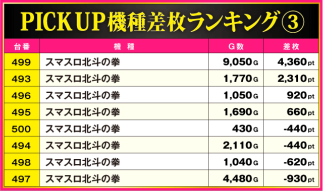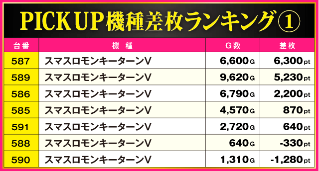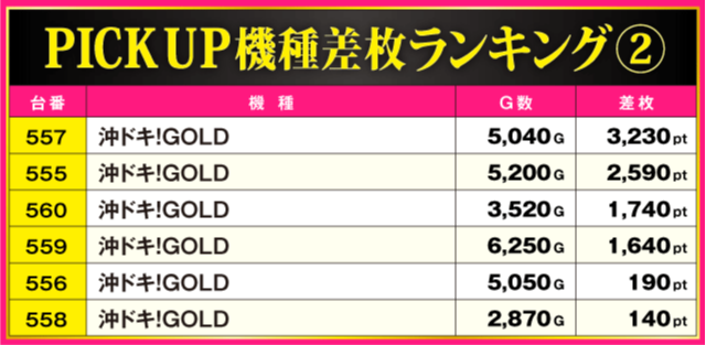 今回のPICK UP機種は全3機種。『スマスロモンキーターンV』からは+6,300pt、『スマスロ北斗の拳』からは+4,360ptといった好成績が確認されている。さらに、『沖ドキ!GOLD』は、設置されている6台全てがプラス差枚で終了するという見事な結果を残しているだけに、ファンにとって充実の一日となったのは間違いないだろう。