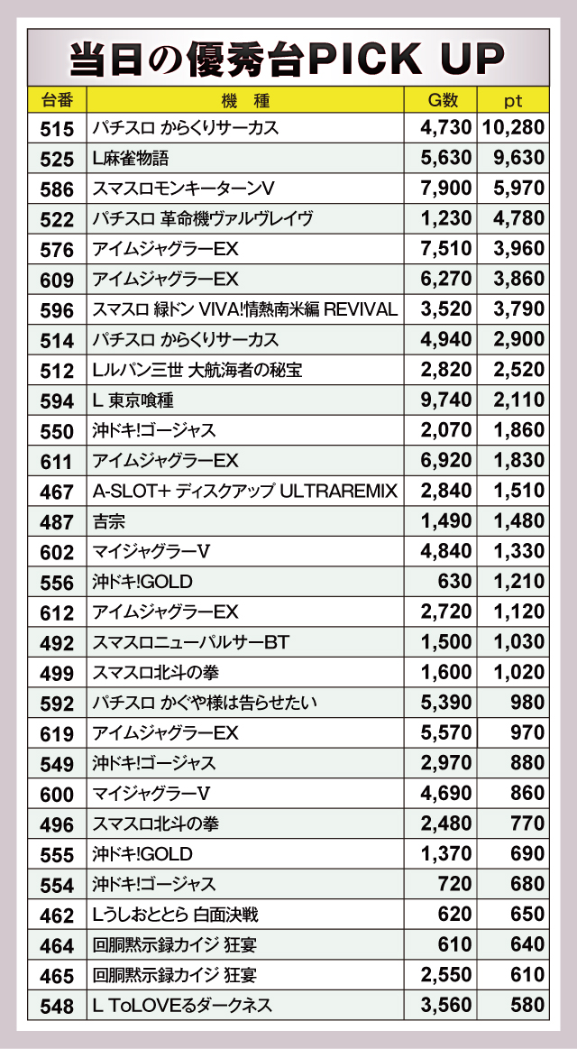 『パチスロ からくりサーカス』515番台が+10,280ptとひときわ輝く好成績を残した。つづく『L麻雀物語』525番台は+9,630ptとこちらも見事な結果となっている。以下、『スマスロモンキーターンV』586番台の+5,970ptや『パチスロ 革命機ヴァルヴレイヴ』522番台の+4,780ptなど、優秀台があちらこちらで誕生していた。