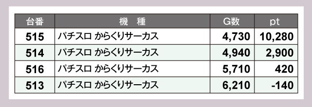 『パチスロ からくりサーカス』は全台がしっかり回されていて、515番台と514番台が十分すぎるほどの成果をあげていた。