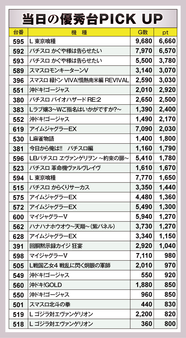 人気機種『L 東京喰種』の595番台が+6,660pt、『パチスロ かぐや様は告らせたい』の592番台が+6,570pt、593番台が+3,780ptと並んだ。他にも『スマスロモンキーターンV』589番台の+3,070pt、『スマスロ 緑ドン VIVA!情熱南米編 REVIVAL』396番台の+3,030ptなど、プレイヤーたちを満足させる結果がひしめき合っている。