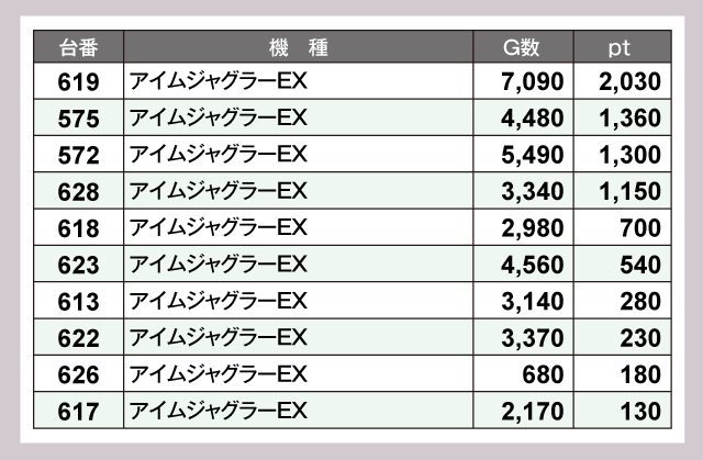 定番の『アイムジャグラーEX』からも多数の優秀台が誕生。プレイヤーが終始、夢中でレバーを叩く様子がうかがえた。