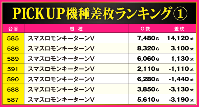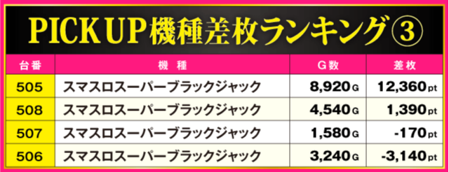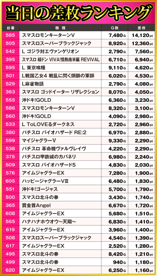 早速、店内状況を見てみると、『スマスロモンキーターンV』の585番台が+14,120pt、『スマスロスーパーブラックジャック』の505番台が+12,360ptと、台番号の末尾が5の台からハイスコアが続出。最終的に、差枚TOP30に末尾5の台が10台もランクインしている点は注目すべきポイントと言えるだろう。