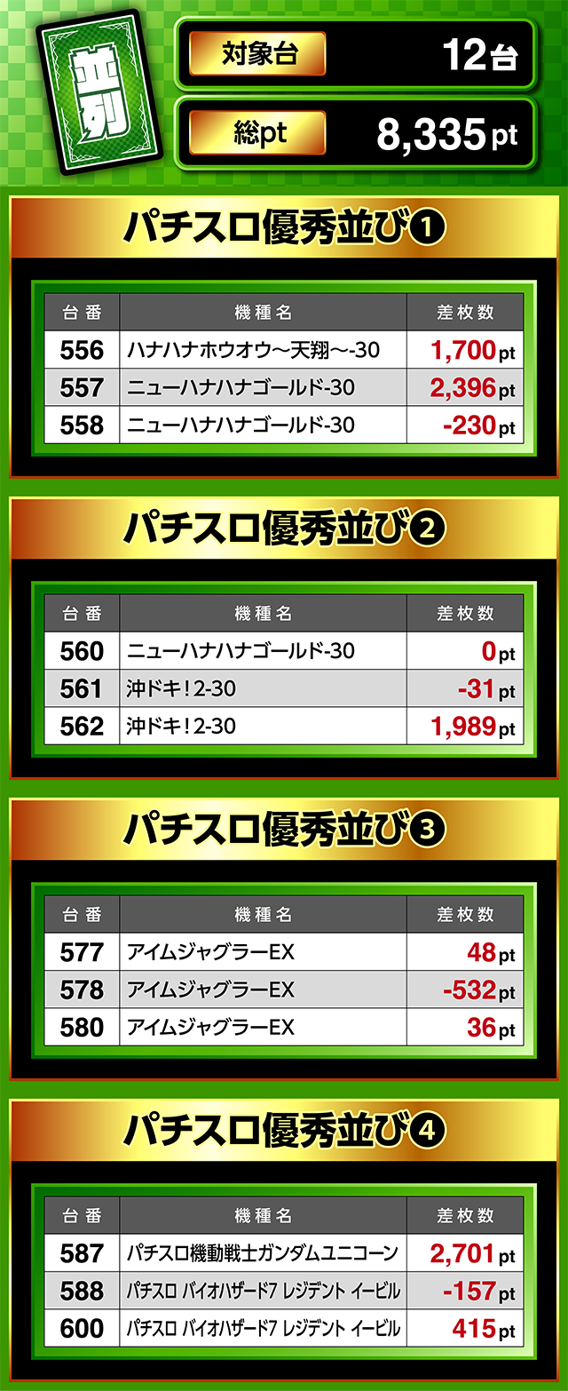 並列は各並びにプラスがあり、580番台の「アイムジャグラーEX」が2,000ptクラス。