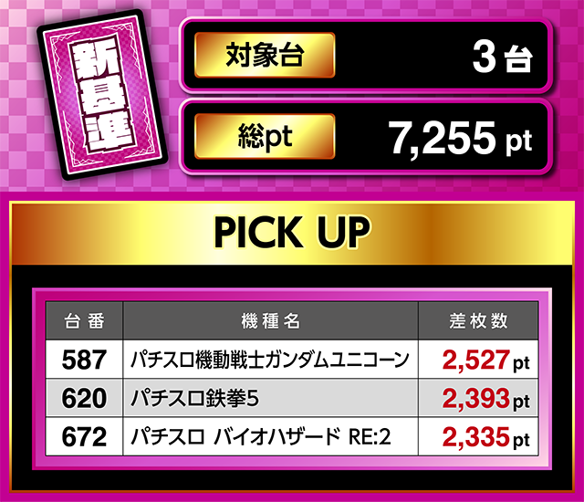 新基準は「パチスロ機動戦士ガンダムユニコーン」に2,700pt超の台アリ。