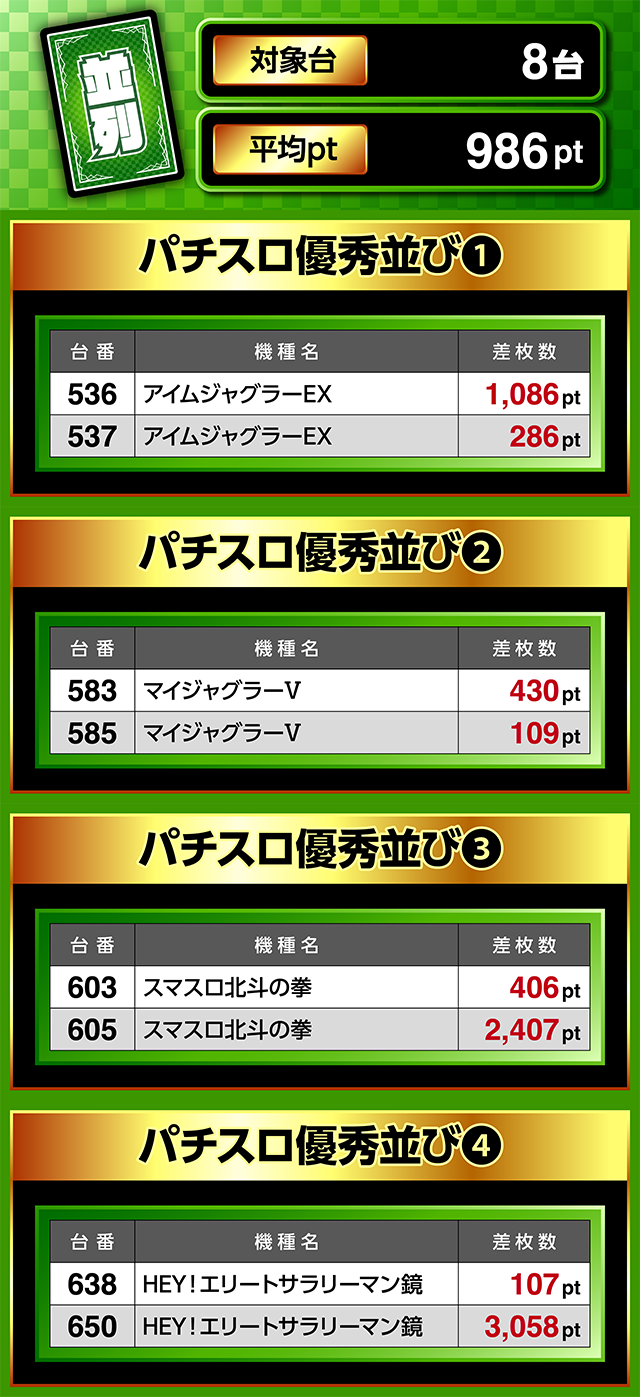 4ヶ所のすべてにプラス台が並び、536番台の「アイムジャグラーEX」は1,086pt。