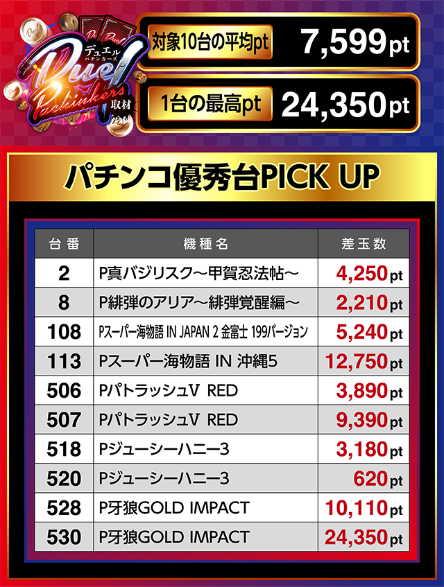 「P牙狼GOLD IMPACT」は設置されている2台のどちらも10,000ptを超え、530番台は24,000ptを上回った。