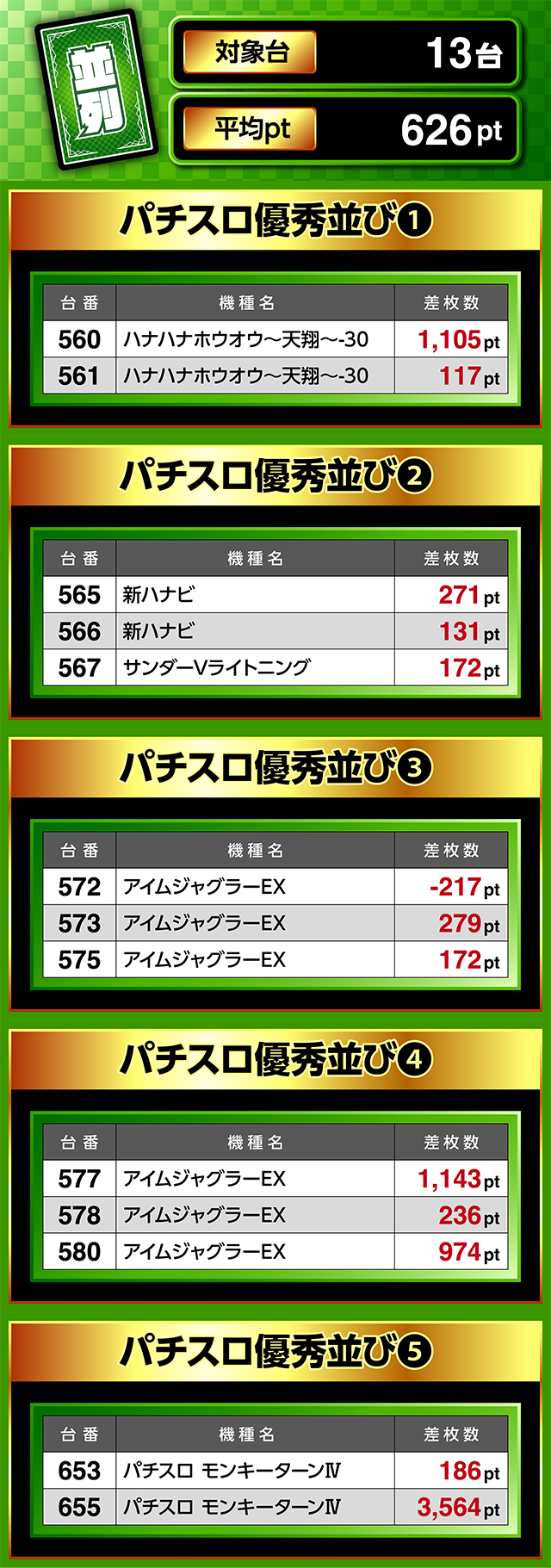 653番台と655番台の「パチスロ モンキーターンⅣ」にプラスが続き、655番台は3,500ptオーバー。