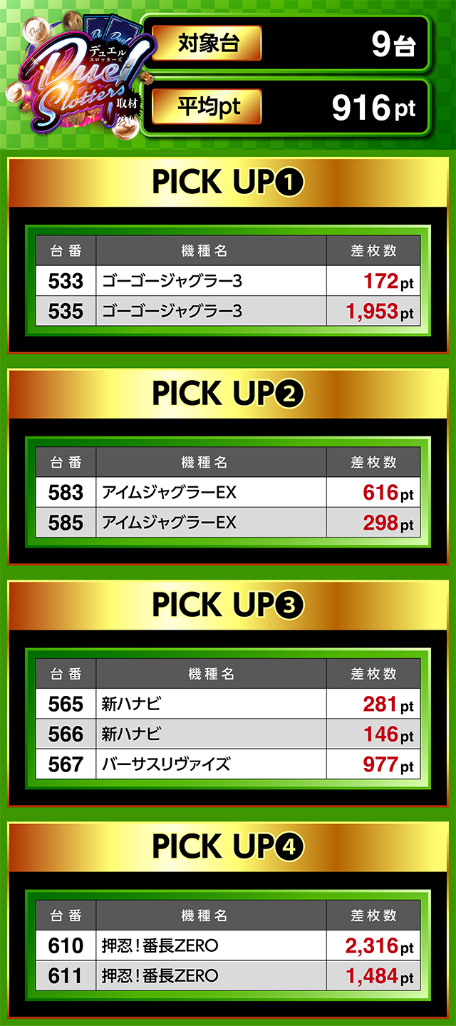 「ゴーゴージャグラー3」も2台並んでプラスとなり、535番台は2,000ptクラス。