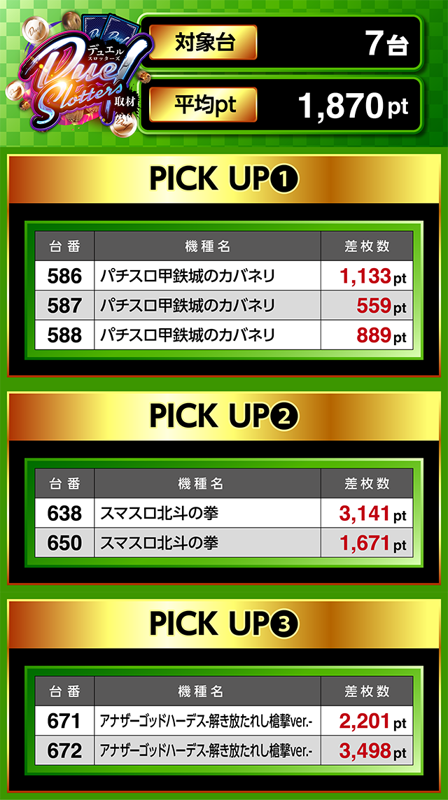2台設置の「アナザーゴッドハーデス-解き放たれし槍撃ver.-」が並んで2,200ptを超え、672番台は3,400ptオーバー!