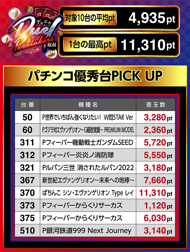 「ぱちんこ シン・エヴァンゲリオン Type レイ」の370番台が11,310pt。