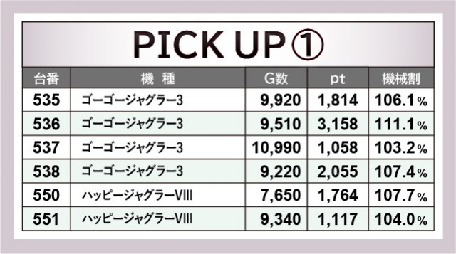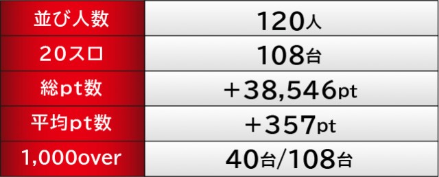 前述したように『ジャグラー』コーナーは高い活気と熱気をキープしていた。その中で『ゴーゴージャグラー3』は万回転OVERを達成し、コンスタントなボーナス当選を披露。また536番台+3,158ptという熱量を確認でき、GOGOランプの輝きが遊技していたファンに至福の瞬間をもたらしていたと言えるだろう。
