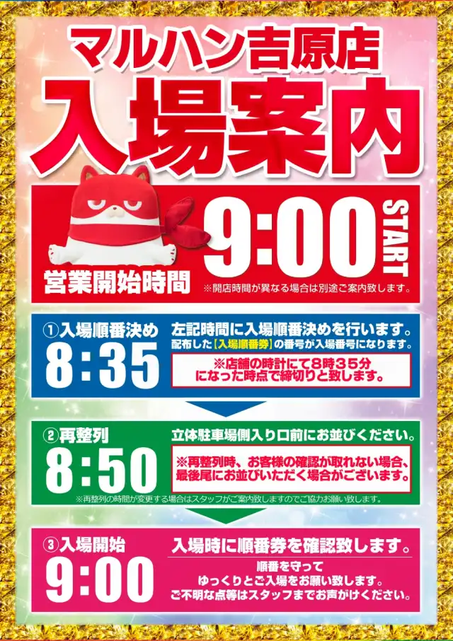 毎日指定時間までに整列されたお客様対象に入場順番決めを行っております。 |