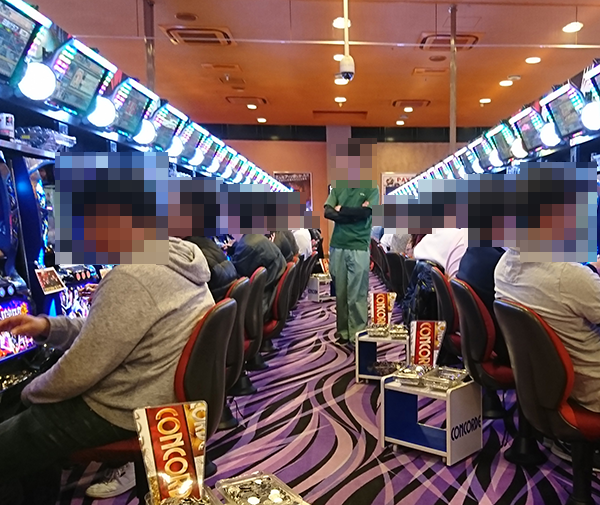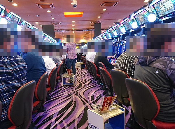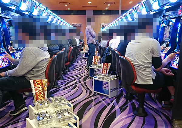 活気づいているホール内では、大勢のプレイヤーが笑みを浮かべて遊技を楽しんでいるといった状況。