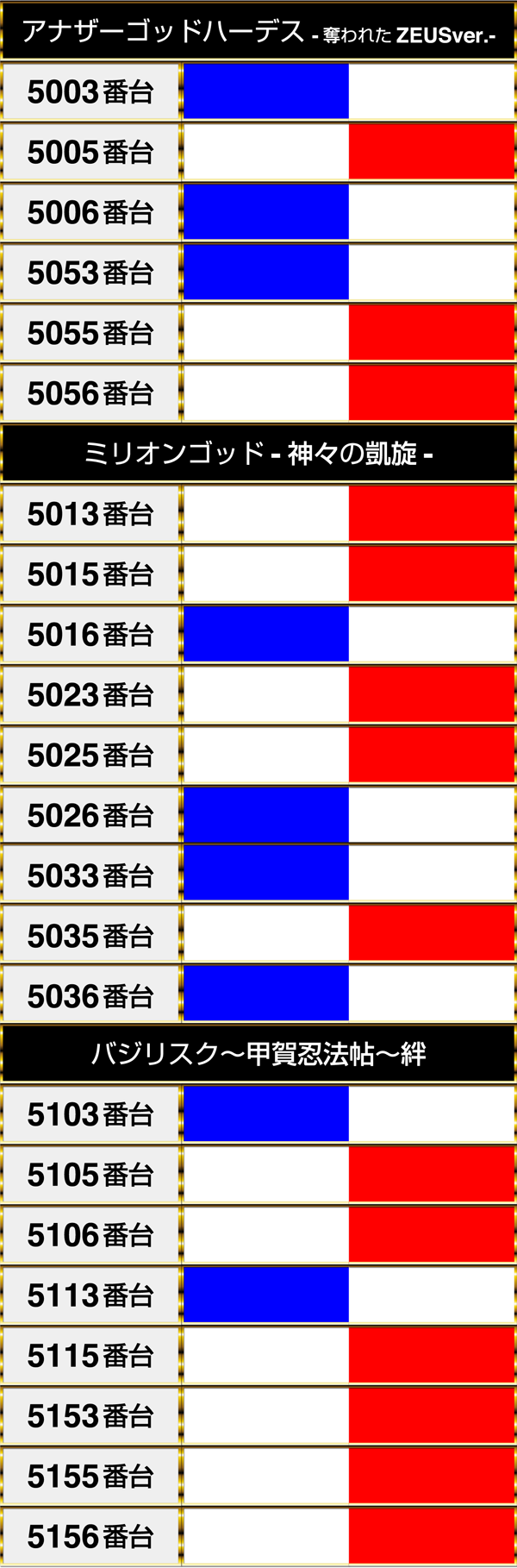 『アナザーゴッドハーデス-奪われたZEUSver.-』の5005番台や『バジリスク~甲賀忍法帖~絆』の5155番台もプラスptを記録してこの日を終えていた。