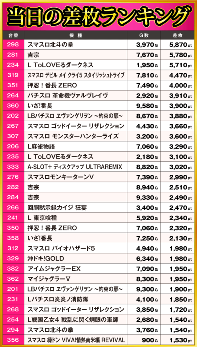 この日は、『スマスロ北斗の拳』と『吉宗』、『L ToLOVEるダークネス』が+5,000pt超を記録するなど、新旧を問わず人気のスマスロを中心に好成績が続出。さらに、様々な機種から+3,000pt超が大量発生しており、広範囲に渡ってチャンスが潜んでいたのは間違いないだろう。
