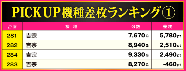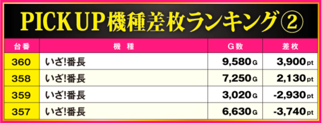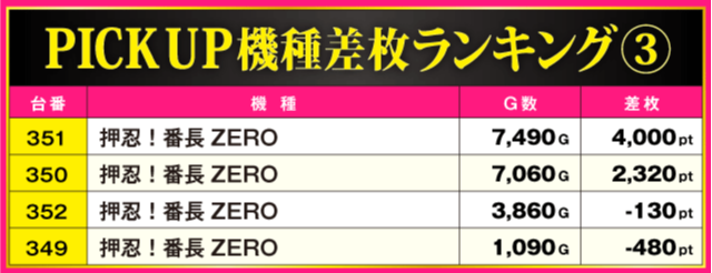 続いてPICK UP機種の状況をチェック!! 差枚上位にランクインした『吉宗』は、最終的に全4台中3台がプラス差枚に。また、『いざ!番長』からは+3,900pt、『押忍!番長ZERO』からは+4,000ptが確認されているだけに、それぞれのシマは常に活気とファンの笑顔に溢れ返っていた。