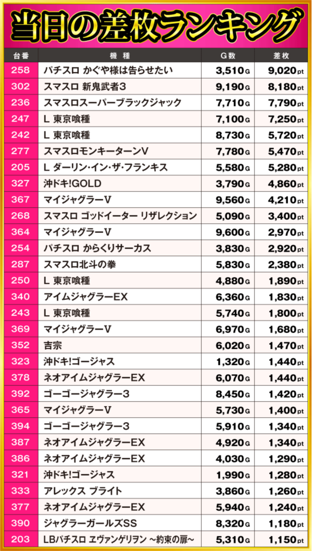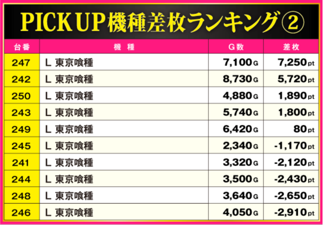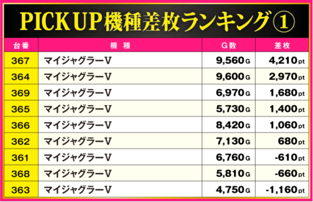 続いてPICK UP機種の状況をチェックしていくと、ランキングを制した『パチスロ かぐや様は告らせたい』以外にも多数の好調台を確認。『マイジャグラーⅤ』は367番台の+4,210ptをはじめ全9台中6台がプラス差枚に。また、『L 東京喰種』は+7,000pt超以外に+5,720ptも発生している。