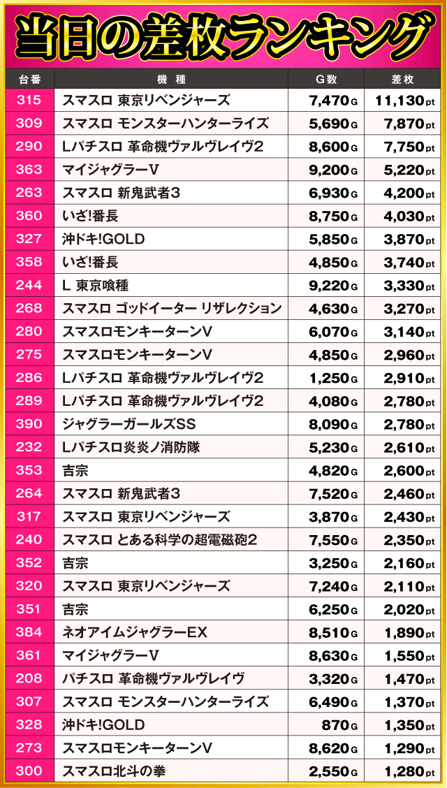 この日、最もプレイヤーの注目を集めたのが『スマスロ 東京リベンジャーズ』で、315番台が万枚超の+11,130ptを叩き出しランキングトップに。次いで『スマスロ モンスターハンターライズ』と『Lパチスロ 革命機ヴァルヴレイヴ2』が+7,000pt超、『マイジャグラーⅤ』が+5,220ptを記録するなど、人気機種を中心にハイスコアが飛び出している。
