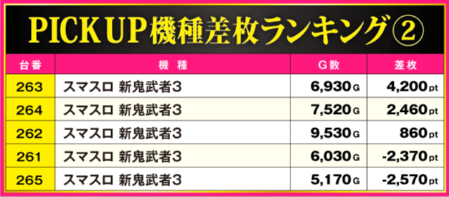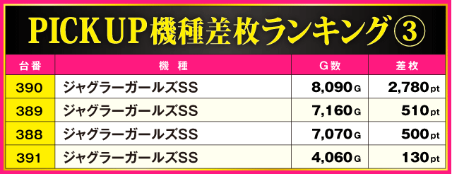 今回のPICK UP機種は全3機種。『L 東京喰種』からは+3,330pt、『スマスロ 新鬼武者3』からは+4,200ptが飛び出し店内を盛り上げていた。また、『ジャグラーガールズSS』は設置されている4台全てがプラス差枚となる見事な結果を残しているだけに、ファンにとっては思う存分に楽しめた一日となったはずだ。