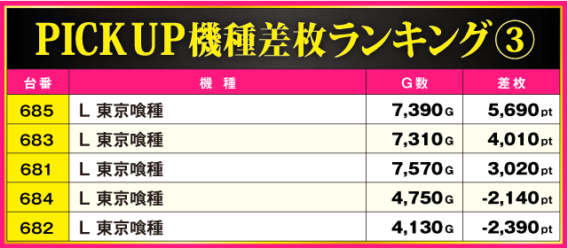 今回のPICK UP機種は全3機種で、ハイスコアを記録した『吉宗』と『スマスロ ゴッドイーター リザレクション』以外にも『L 東京喰種』から+5,690ptが発生。しかも、3機種トータルの全15台中10台がプラス差枚となっているだけに、ファンにとって充実の一日となったのは間違いないだろう。