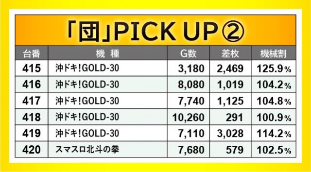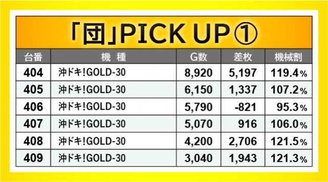 設置台数は然ることながら、多くのファンから信頼を集めているのが『沖ドキ!GOLD-30』『スマスロ北斗の拳』である。特に後者は全国的な人気も相まって、どの台も朝から終日打ち込まれていたのが鮮烈だ。その中で生まれたのが428番台+7,247枚であり、ほかにも423番台+5,464枚や452番台+5,825枚であり、また前者においても404番台+5,197枚というポテンシャルを見せつける結果を披露してくれた。