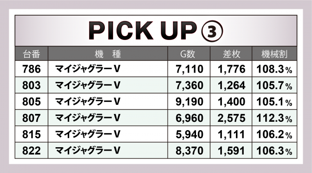 まずは優秀30台のPICK UPから見ていこう。表の半数近くがジャグラーシリーズで埋まっており同店の注力ぶりが見て取れる。後述する好調3機種以外では『ファンキージャグラー2』が3台合計で差枚数+7千枚を突破!