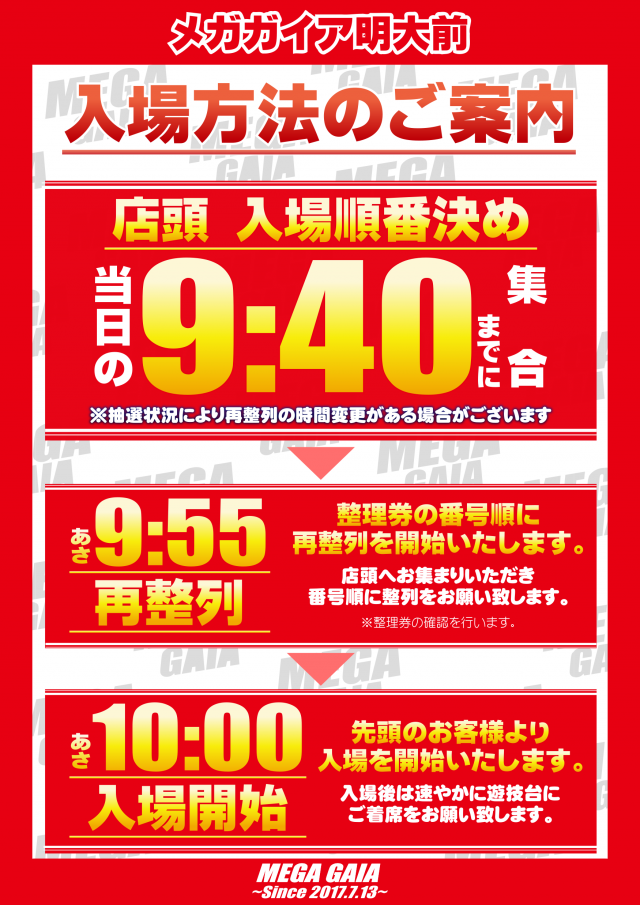 当店抽選方法は、オンラインにて8:00~9:00までに受付締切、9:50に整列となります!!! 詳細は店舗公式ライン登録から入場くんへ!! |